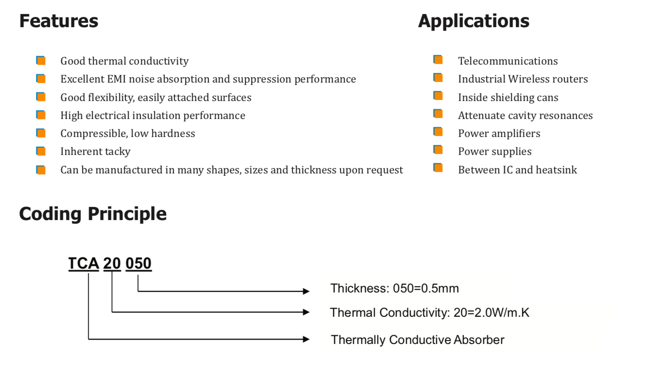 TM TCA系列导热吸收材料是一种填充陶瓷和铁氧体颗粒的硅基复合材料。设计用于吸收电磁噪声(谐振腔、串扰和耦合)并填充热界面之间的间隙。TCA系列吸收材料具有自粘性,组装时不需要任何胶带。" />