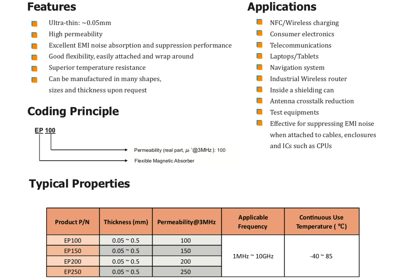 TM EP系列柔性磁吸收材料设计用于抑制电子设备产生的有害电磁波和高频噪声。本产品还可用于保护产品免受外部噪音的影响,从而减少由相邻电子产品的电磁波引起的故障和干扰。" />