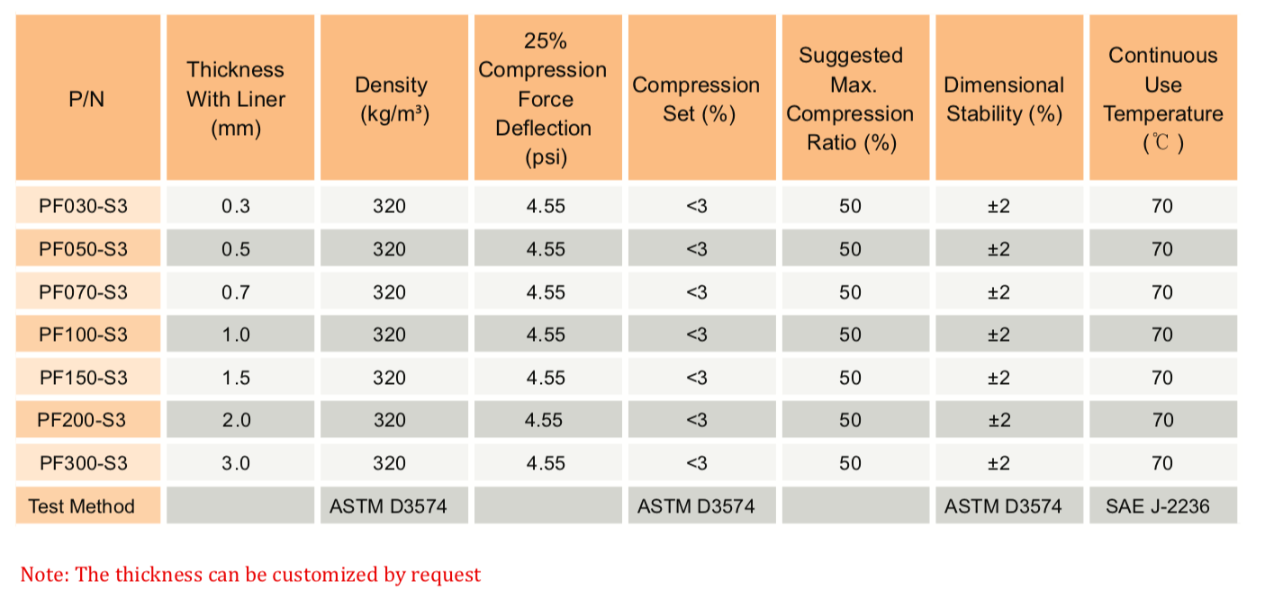 TMPF-S3 系列是一种中等柔软、快速回弹的泡棉,具有缓震、保护作用 密封和电子设备中的长期间隙填充。S3系列泡棉具有极低的压缩永久变形、高密封性能和优异的冲击吸收性能。" />
