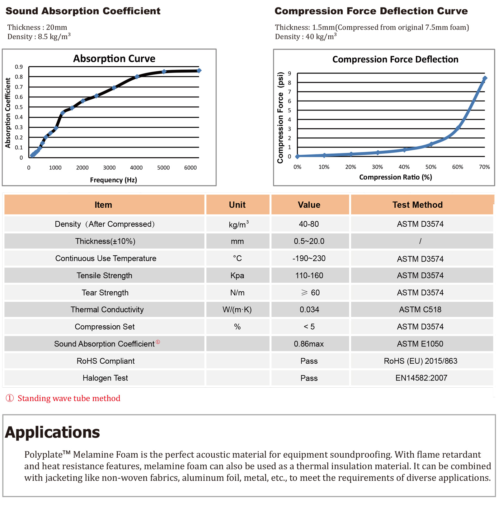 TM 三聚氰胺泡棉是由三聚氰胺树脂制成的热固性聚合物。开孔具有三维网状结构的特征。这种结构使得泡棉在阻挡噪声和隔热方面有效。三聚氰胺泡棉以三聚氰胺树脂为原料,本身具有优异的阻燃性能。三聚氰胺泡棉还具有优异的耐温性和热稳定性。它可以在极端温度下保持其物理特性。在电子行业,这种泡沫通常被压缩到其原始厚度的15%-20%,以获得最佳的吸声效果。标准泡沫颜色为白色和灰色。其他颜色可根据要求提供。" />