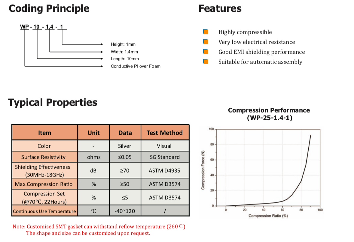 TM WP系列导电PI覆盖泡棉材料由高导电性的Cu/Ni镀层PI、PU泡棉组成 芯和导电压敏丙烯酸粘合剂。这些高度可压缩的材料 设计用于提供卓越的EMI屏蔽和接地性能,并且防尘和 防潮。WP系列产品很容易缩小尺寸,特别适用于计算机内的固定垫圈应用, 智能手机、液晶显示器/电视和电信制造业。 可根据要求定制回流焊垫片。" />