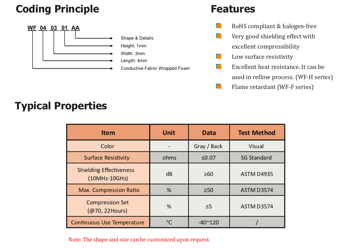 TMWF系列导电布包裹泡棉由高导电布、PU泡棉芯和导电压敏丙烯酸粘合剂组成。这些高度可压缩的材料专门设计用于提供卓越的EMI屏蔽和接地性能,并且可以提供优秀的防尘和防潮保护。WF系列产品极易调整尺寸,适用于计算机、智能手机、液晶显示器和电信制造行业,如固定垫圈。" />